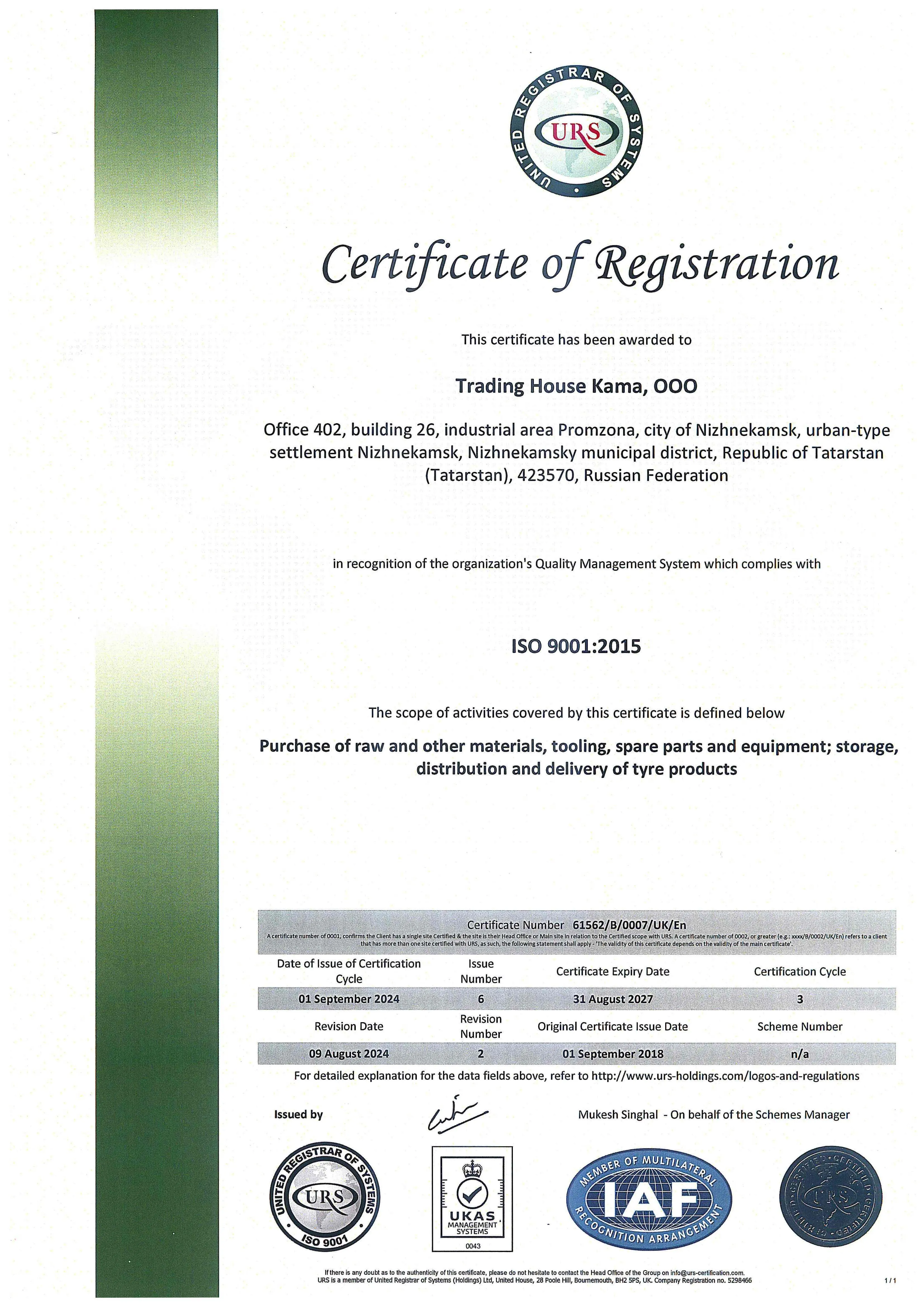 Сертификат соответствия системы менеджмента качества» ООО "Торговый дом "Кама" требованиям международного стандарта ИСО 9001:2015.